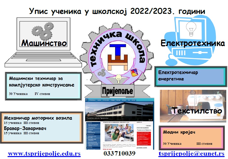 Добродошли на сајт Техничке школе Пријепоље.        Школа уписује следеће атрактивне смерове: