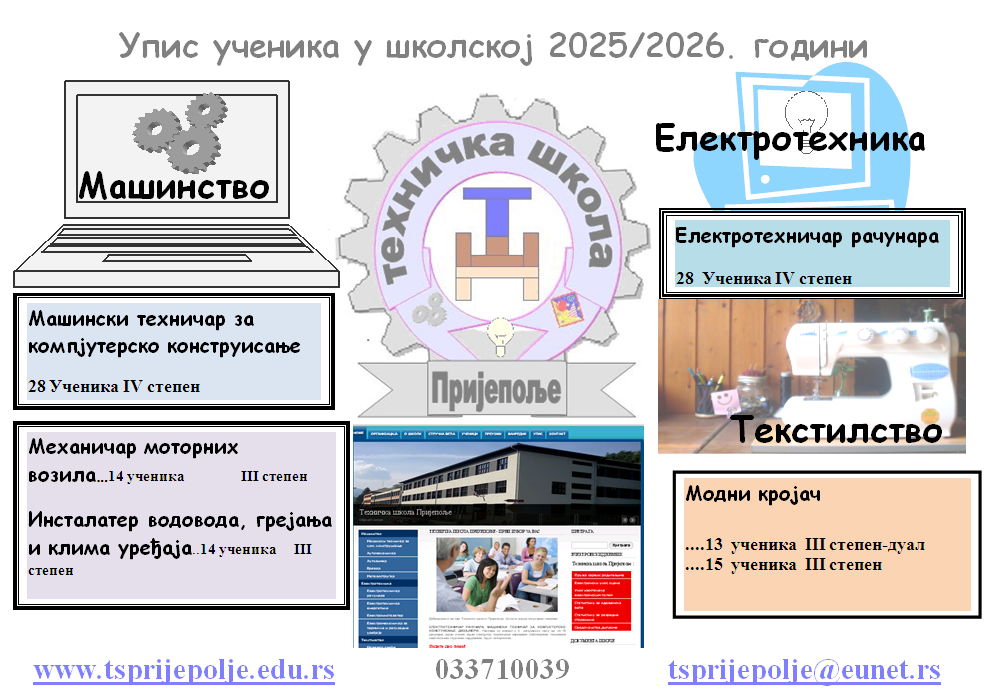 Добродошли на сајт Техничке школе Пријепоље.        Школа уписује следеће атрактивне смерове: